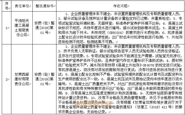 省住建廳對督查組下發整改通知單的平涼陽光建工混凝土有限責任公司、甘肅西部建材有限責任公司、蘭州金建混凝土有限公司三家企業,給予全省通報批評。對于三家企業存在的問題,相關市建設行政主管部門均督促企業進行了整改,并向督查組報送了書面整改報告,其中平涼市對企業負責人進行了約談,蘭州市將甘肅西部建材有限責任公司列入黑榜進行公布,對相關企業加大了監管力度。