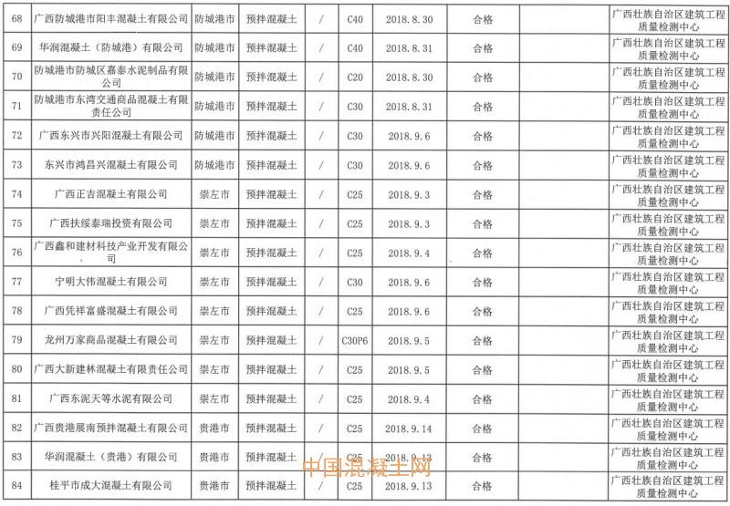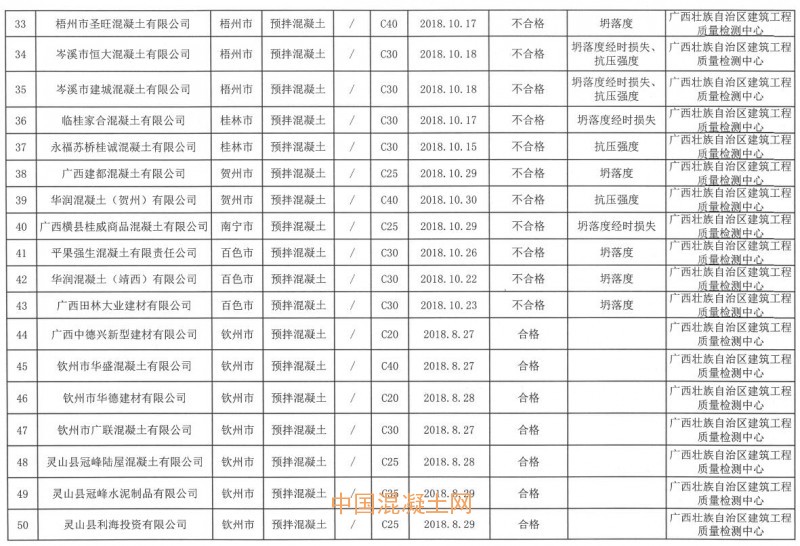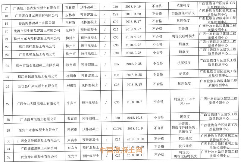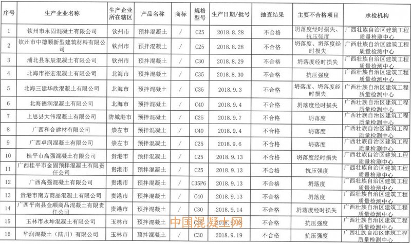 近日,廣西壯族自治區市場監督管理局、廣西壯族自治區工業和信息化廳聯合發布《關于2018年廣西預拌混凝土產品質量聯合監督抽查情況的通報》。據通報,2018年共抽取廣西200家預拌混凝土企業生產的200批次產品。抽查主要以《2018年預拌混凝土產品質量廣西監督抽查實施細則》為檢驗依據,經檢驗,合格產品157批次,不合格產品43批次,不合格產品檢出率為21.5%。