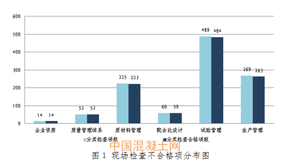四季度共計(jì)檢查預(yù)拌混凝土企業(yè)31家次,檢查1109項(xiàng)次,合格率為98.7%,其中不合格項(xiàng)主要出現(xiàn)在試驗(yàn)管理和生產(chǎn)管理方面,具體情況見圖1。抽檢混凝土試塊(拌合物)62組,全部達(dá)到設(shè)計(jì)強(qiáng)度的100%;抽檢原材料24組,合格23組,合格率為95.8%。針對檢查發(fā)現(xiàn)的問題下發(fā)責(zé)令改正通知書2份,立案1起。
