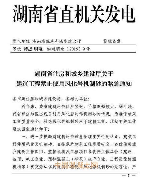 近年來,湖南建筑用砂供應緊張,價格也一路看漲。據反映,省內部分地區出現利用風化巖制作機制砂的情況。為確保建筑工程質量安全,省住建廳下發《關于建筑工程禁止使用風化巖機制砂的緊急通知》,杜絕風化巖機制砂用于建筑工程。