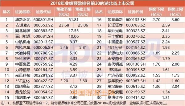 66家披露2018年業績預告的湖北省上市公司中,55家業績預盈,占比83%。其中,4家公司預盈超10億,7家預盈超5億。
