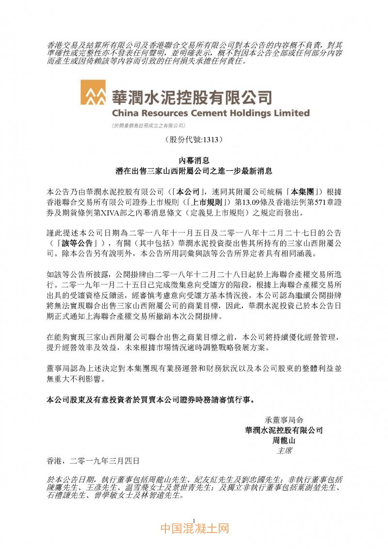 華潤水泥控股(01313)公布,就潛在出售3家山西附屬公司,2019年1月25日已完成征集意向受讓方的階段,根據上海聯合產權交易所出具的受讓資格反饋函,經審慎考慮意向受讓方基本情況后,該公司認為繼續公開掛牌將無法實現聯合出售3家山西附屬公司的商業目標,因此,華潤水泥投資已于公告日期正式通知上海聯合產權交易所撤銷本次公開掛牌。