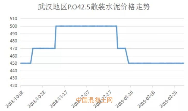 從圖中可以看出,武漢地區(qū)水泥價格2018年11月升至高位,2019年元旦后陸續(xù)下調(diào)兩波,兩波累計下調(diào)40-50元/噸,春節(jié)后水泥價格整體保持穩(wěn)定。