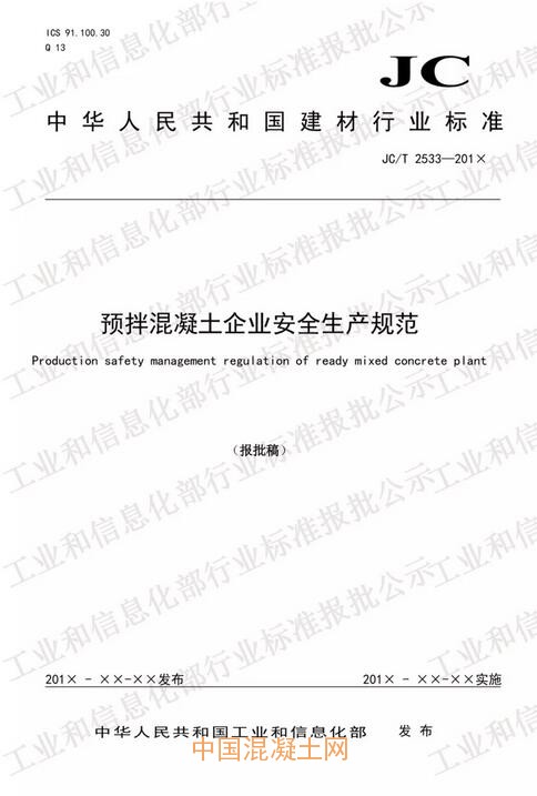 根據行業標準制修訂計劃,工業和信息化部科技司對相關標準化技術組織等單位已完成的161項行業標準予以報批公示,其中涉及由中國混凝土與水泥制品協會、嘉興學院建筑工程學院、蘇州混凝土水泥制品研究院有限公司負責制定的《預拌混凝土企業安全生產規范》及其他4項建材行業標準。