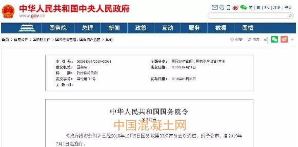 《政府投資條例》已經2018年12月5日國務院第33次常務會議通過,現予公布,自2019年7月1日起施行。
