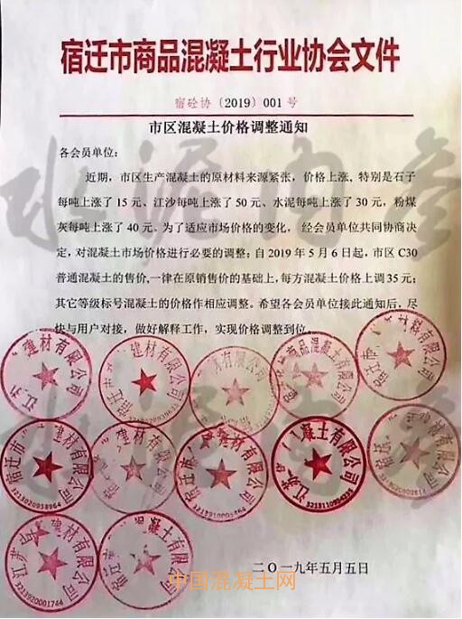 5月5日,江蘇宿遷市商品混凝土行業協會發布《市區混凝土價格調整通知》,宣布自5月6日起,C30普通混凝土售價每方上調35元。