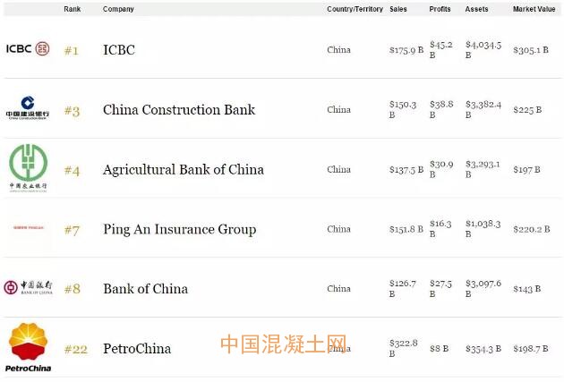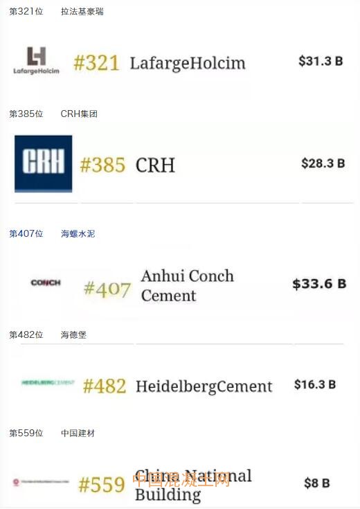榜單依據各企業營業收入、利潤收益、資產規模、市值等指標進行綜合評價最終形成,上榜公司分布在61個國家與地區,中國內地和香港有309家上榜,水泥行業前三大集團均進入排行榜,其中,安徽海螺水泥排名位居第407位,中國建材集團位居第559位,金隅集團位居第1054名。榜單首位為連續七年摘得桂冠的中國工商銀行。