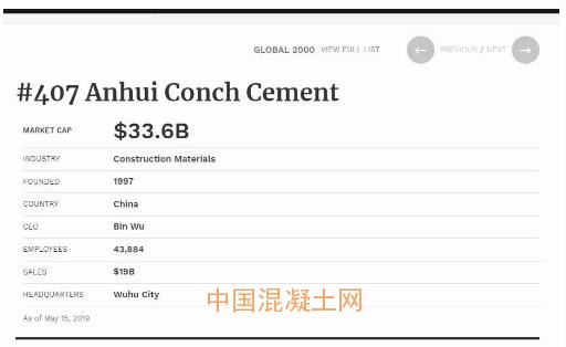 榜單顯示,安徽海螺水泥排名第407位,已步入世界五百強行列,較2018年提升115位。2018年《福布斯全球企業2000強》榜單,安徽海螺水泥股份有限公司排名第522位。
