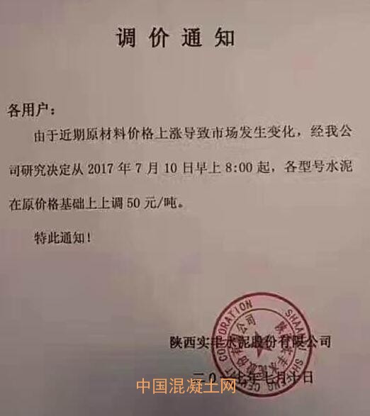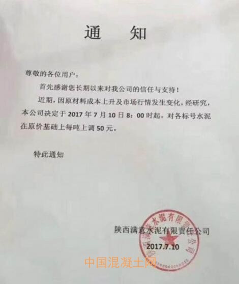 記者在隨后拿到的2017年7月10日的《調價通知》中看到:陜西實豐水泥股份有限公司、陜西富平生態水泥有限公司、陜西滿意水泥有限責任公司、冀東水泥銅川有限公司、西安藍田堯柏水泥有限公司、堯柏特種水泥集團有限公司蒲城分公司、陜西聲威建材集團有限公司給用戶發出的《調價通知》內容均為:“從2017年7月10日早上8時起,各型號水泥在原價格基礎上上調50元/噸?!?