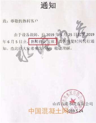 5月24日,山西省吉港水泥有限公司發布通知,稱由于設備故障,自2019年5月25日起至2019年6月5日止,熟料停止發放。具體恢復時間另行通知。