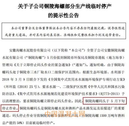 2018年6月12日,安徽海螺水泥股份有限公司發布關于子公司銅陵海螺部分生產線臨時停產的提示性公告,稱由于銅陵海螺碼頭處于銅陵市三水廠取水口二級保護區范圍內,根據生態環境部、水利部于2018 年 3 月 9 日聯合下發的《全國集中式飲用水水源地環境保護專項行動方案》(環環監〔2018〕25 號),要求水源一、二級保護區按照《中華人民共和國水污染防治法》、《集中式飲用水水源地規范化建設環境保護技術要求》(HJ773-2015)予以清理整治,要求銅陵海螺立即停止碼頭作業。