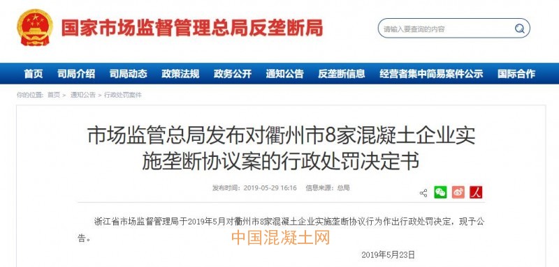 浙江省市場(chǎng)監(jiān)督管理局于2019年5月對(duì)衢州市8家混凝土企業(yè)實(shí)施壟斷協(xié)議行為作出行政處罰決定,現(xiàn)予公告。