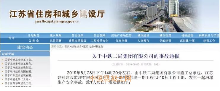 6月5日,江蘇省住建廳通報(bào)一則坍塌事故。2019年5月28日下午14時(shí)20分左右,由中鐵二局集團(tuán)有限公司施工總承包,江蘇建科建設(shè)監(jiān)理有限公司監(jiān)理的常州地鐵2號(hào)線一期工程TJ-10標(biāo)工程工地,發(fā)生一起坍塌事故,致1人死亡。