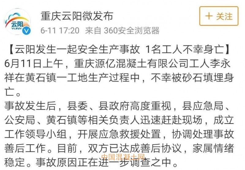 昨日(6月11日)上午,重慶源億混凝土有限公司工人李永祥在黃石鎮一工地生產過程中,不幸被砂石填埋身亡。