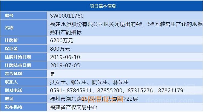 受企業委托,福建省產權交易中心掛牌出讓福建水泥股份有限公司擬關閉退出的4#、5#回轉窯生產線的水泥熟料產能指標,現公告如下: