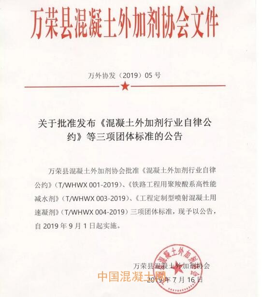 2019年7月16日,萬榮縣混凝土外加劑協會發布公告“關于批準發布《混凝土外加劑行業自律公約》等三項團體標準的公告”(2019年05號),由萬榮縣混凝土外加劑協會標準部和山西黃騰化工有限公司主編的團體標準T/WHWX 001-2019《混凝土外加劑行業自律公約》、由山西省混凝土外加劑產品質量監督檢驗中心和山西鐵力建材有限公司主編的團體標準T/WHWX 003-2019《鐵路工程用聚羧酸系高性能減水劑》、由山西省混凝土外加劑產品質量監督檢驗中心和山西凱迪建材有限公司主編的團體標準T/WHWX 004-2019《工程定制型噴射混凝土用速凝劑》將于2019年9月1日起實施。