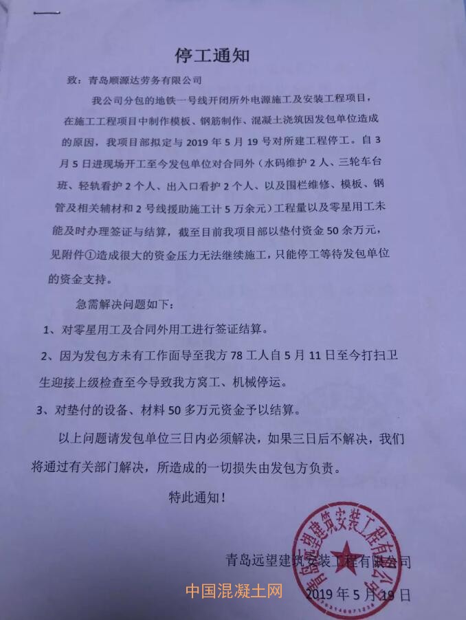 但劉飛云拿不出錢發工資了。5月19日,遠望公司向順源達發出“停工通知”,稱因為對方拖欠資金,己方擬于2019年5月19日停工。與此同時,遠望公司提出讓順源達結算零星用工費、合同外用工費及自己墊付的設備材料費,共計53.1萬元。