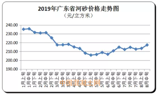 8月中旬,全省河砂平均購進價為每立方米217元,環比上升1.8%(與2019年8月上旬相比,下同)。其中,粵西和珠三角地區購進價漲幅較大,均價分別為每立方米220元和200元,環比分別上升3.53%和3.61%。