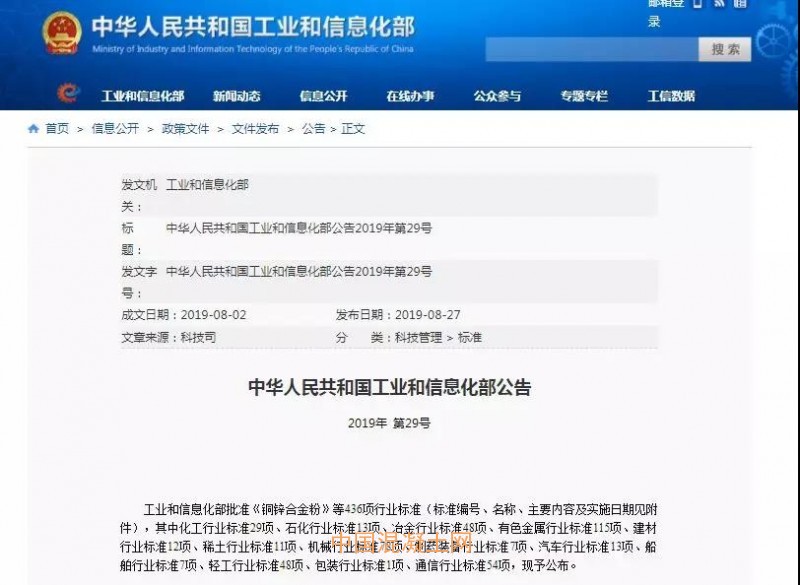 日前,工信部網站發布了2019年第29號公告。公告表明,工業和信息化部批準《銅鋅合金粉》等436項行業標準(標準編號、名稱、主要內容及實施日期見附件),其中化工行業標準29項、石化行業標準13項、冶金行業標準48項、有色金屬行業標準115項、建材行業標準12項、稀土行業標準11項、機械行業標準78項、制藥裝備行業標準7項、汽車行業標準13項、船舶行業標準7項、輕工行業標準48項、包裝行業標準1項、通信行業標準54項,現予公布。