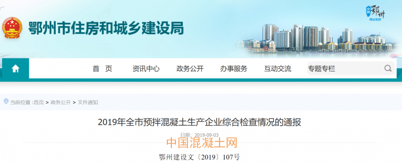 近日,鄂州市住建局發布《2019年全市預拌混凝土生產企業綜合檢查情況的通報》,根據《關于對全市預拌混凝土生產企業進行綜合檢查的通知》要求,市住建局于近期組織專班對全市預拌混凝土生產企業進行了綜合檢查。