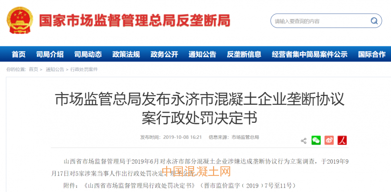 10月8日,國家反壟斷局在官網通報了一起建材領域的反壟斷行政處罰案件。山西5家混凝土企業因達成固定混凝土價格的壟斷協議,被山西省市場監管局合計處罰25萬元。記者統計發現,這是市場監管總局反壟斷局今年公布的第4起建材領域的反壟斷案件。