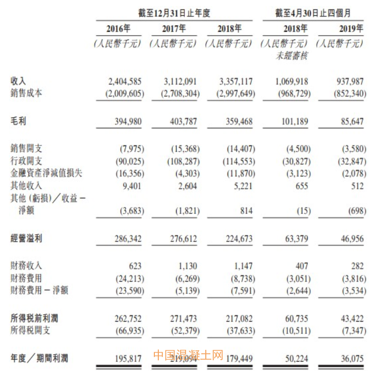 于往績記錄期間,。公司的收入由2016年的人民幣2,404.6百萬元上升至2017年的人民幣3,112.1百萬元并進一步上升至2018年的人民幣3,357.1百萬元,復合年增長率約為18.2%,主要由于預拌混凝土銷量增加以及原材料中的水泥價格上漲導致預拌混凝土的平均價格上升所致。公司的總收入由截至2018年4月30日止四個月的人民幣1,069.9百萬元減少12.3%至截至2019年4月30日止四個月的人民幣938.0百萬元,主要是由于預拌混凝土的銷量減少所致。