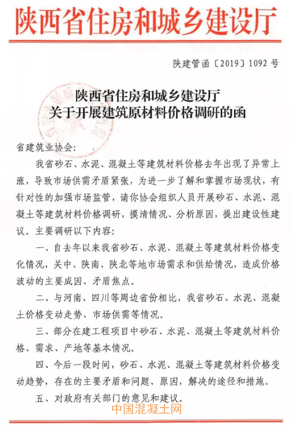 針對2018年以來混凝土及砂石行業(yè)價格異常、市場供需矛盾緊張等問題,為進(jìn)一步了解和掌握市場現(xiàn)狀,有針對性的加強(qiáng)市場監(jiān)管,陜西省住建廳將開展砂石、水泥、混凝土等建筑材料價格調(diào)研工作,旨在摸清情況、分析原因,梳理解決的途徑和措施。