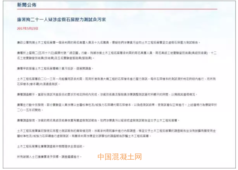 2017年,香港廉政公署收到土木工程拓展署轉達的貪污投訴,而后展開調查。17年5月23日,廉署發布新聞稿,證實在港珠澳大橋香港段的建設中,香港土木工程拓展署的一家承包商涉嫌貪污,并向土木工程拓展署提供虛假混凝土壓力測試報告。