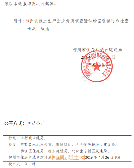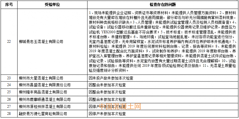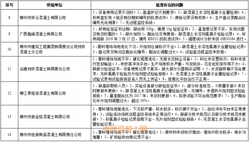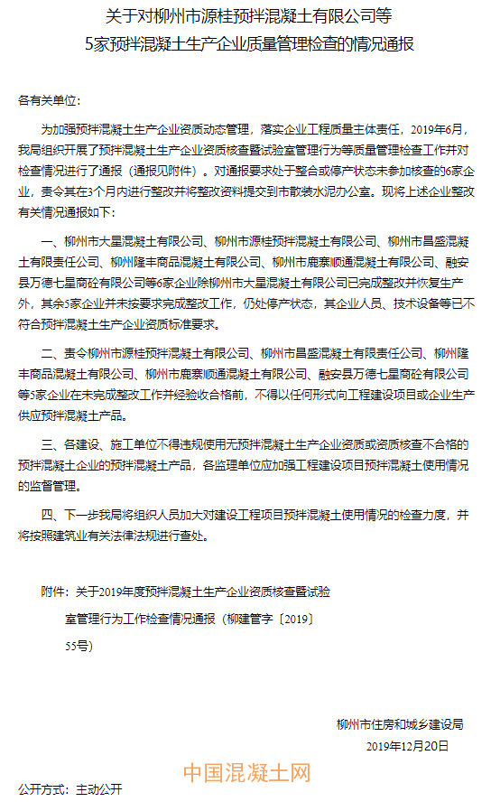 近日,柳州市住房和城鄉建設局發布《關于對柳州市源桂預拌混凝土有限公司等5家預拌混凝土生產企業質量管理檢查的情況通報》,通報稱柳州市源桂預拌混凝土有限公司、柳州市昌盛混凝土有限責任公司、柳州隆豐商品混凝土有限公司、柳州市鹿寨順通混凝土有限公司、融安縣萬德七星商砼有限公司等5家企業并未按要求完成整改工作,仍處停產狀態,其企業人員、技術設備等已不符合預拌混凝土生產企業資質標準要求。責令上述5家企業在未完成整改工作并經驗收合格前,不得以任何形式向工程建設項目或企業生產供應預拌混凝土產品。