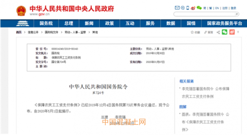 日前,中央人民政府網(wǎng)站發(fā)布了中華人民共和國國務(wù)院令第724號。該文件顯示,《保障農(nóng)民工工資支付條例》已經(jīng)2019年12月4日國務(wù)院第73次常務(wù)會(huì)議通過,現(xiàn)予公布,自2020年5月1日起施行。