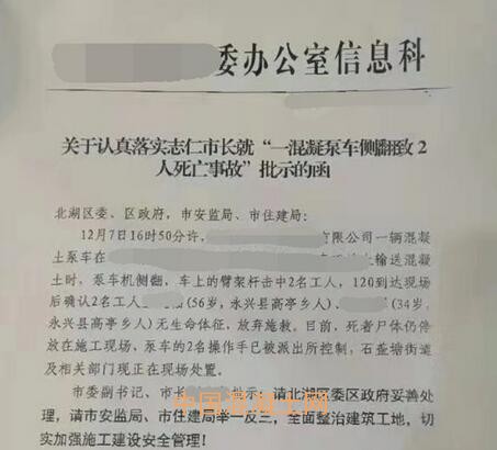 一混凝土泵車側翻致2人死亡事故的批示函,圖中寫到:某混凝土公司泵車在輸送混凝土時,泵車側翻,車上的臂架桿擊中2名工人,120到達現場后確認2名工人已無生命特征放棄施救。目前,死者仍停放在施工現場,泵車的2名操作手已經被派出所控制。
