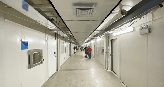醫(yī)院以“潔污分流、醫(yī)患分流、人物分流”為原則,采用嚴格的“三區(qū)兩通道”設計,醫(yī)護人員按“清潔區(qū)—半污染區(qū)—污染區(qū)”的工作流程布置工作區(qū)域。每進入一級區(qū)域,醫(yī)護通道與病患通道完全分離。在隔離病區(qū)病房內設有一個由兩層玻璃和紫外線系統(tǒng)構成的傳遞艙,病人的餐食和藥品都會從這個傳遞艙傳遞進來,通過傳遞艙內的紫外線系統(tǒng)消毒,避免感染。每個病房安置有兩個床位,房間內有獨立的衛(wèi)生間,多重保護下,為醫(yī)護工作者提供安全可靠的工作環(huán)境。