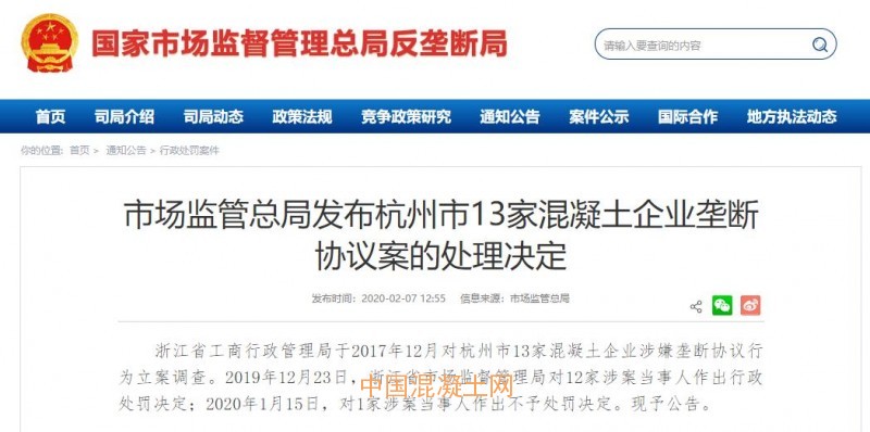 日前,浙江省工商行政管理局于2017年12月對(duì)杭州市13家混凝土企業(yè)涉嫌壟斷協(xié)議行為立案調(diào)查。2019年12月23日,浙江省市場(chǎng)監(jiān)督管理局對(duì)12家涉案當(dāng)事人作出行政處罰決定;2020年1月15日,對(duì)1家涉案當(dāng)事人作出不予處罰決定。