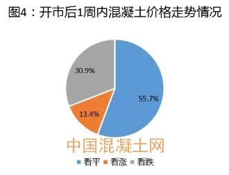 針對復工后1周內混凝土價格看漲、看平或看跌的情況調研來看,55.7%的企業認為開市后1周混凝土價格波動不會很大,價格保持穩定運行狀態,而看平的混凝土企業多集中于西南區域。30.9%的混凝土企業認為開市后1周內混凝土價格或將有所下跌,看跌的混凝土企業多集中于華北、華中兩大區域。13.4%的混凝土企業認為開市后1周內混凝土價格或將上漲,看漲的混凝土企業多集中于華東、華南兩大區域。其主要原因在于華南、華東兩大區域混凝土的生產成本相對偏高,且商混企業認為開市后需求將會大幅提升,因此價格上漲的可能性較大。