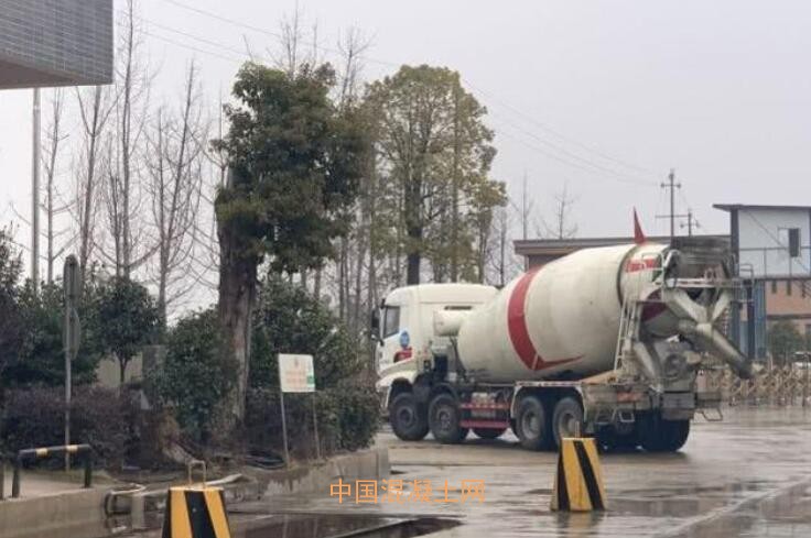 一臺攪拌車正滿載混凝土駛離廠區(qū)前往項目工地。