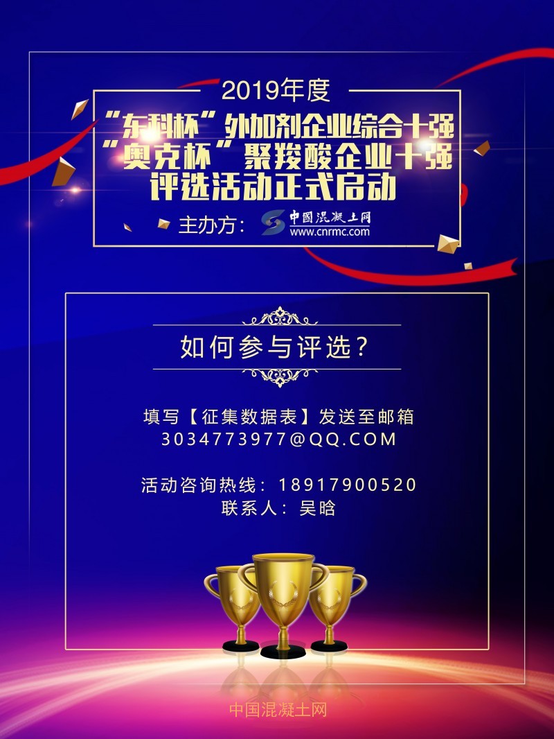 中國混凝土網自2010年舉辦十強企業評選活動以來,受到眾多業內人士的關注與支持。目前“東科杯”2019年度外加劑企業綜合十強,“奧克杯”聚羧酸企業十強評選活動已正式啟動,中國混凝土網秉著公平、公開的原則,現在全國范圍內公開征集混凝土外加劑企業銷售及企業規模等數據,我們將通過對各項數據的權重比較得出最終排名。望相關企業能夠積極踴躍參與,共同推動外加劑行業的繁榮與發展!