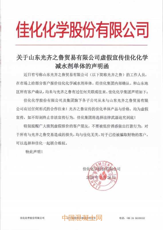 近日有號稱山東光齊之魯貿(mào)易有限公司(以下簡稱光齊之魯)的工作人員,在市場上給部分客戶報價佳化化學(xué)減水劑單體,經(jīng)佳化集團內(nèi)部確認(rèn)、和山東地區(qū)所有客戶確認(rèn),均未與光齊之魯有過任何關(guān)聯(lián)或往來。