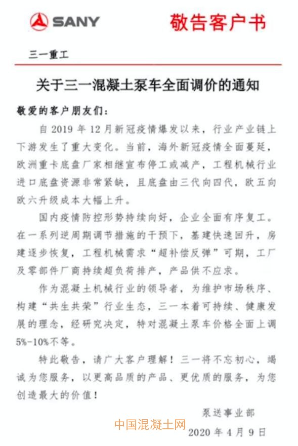 2020年4月9日,三一重工泵送事業部發布敬告客戶書——《關于三一混凝土泵車全面調價的通知》,通知內容顯示,其公司的混凝土泵車價格將上調5%~10%不等。