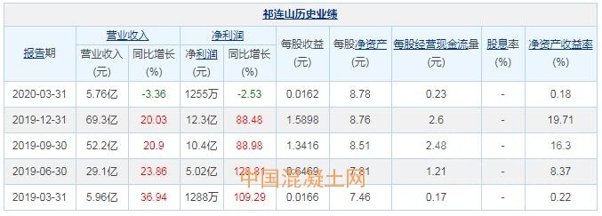 根據祁連山4月20日最新公布的2020年一季報顯示,其營業收入5.76億元,同比下降3.36%;歸屬于上市公司股東的凈利潤1255萬元,同比下降2.53%。