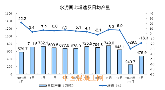 根據國家統計局數據顯示,2020年1-3月份,全國累計水泥產量2.99億噸,同比下降23.9%。3月份,全國單月水泥產量1.48億噸,同比下降18.3%。