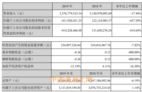 據了解,2019年度,公司實現營業收入257,677.95萬元,較上年同期下降17.44%;實現歸屬于上市公司股東的凈利潤-41,192.04萬元,較上年同期下降437.29%。商品混凝土銷售量較上年同期下降30.63%,同時受生產混凝土所需水泥、河沙、碎石等原材料價格上升的影響,公司商品混凝土毛利率下滑,營業利潤下降。