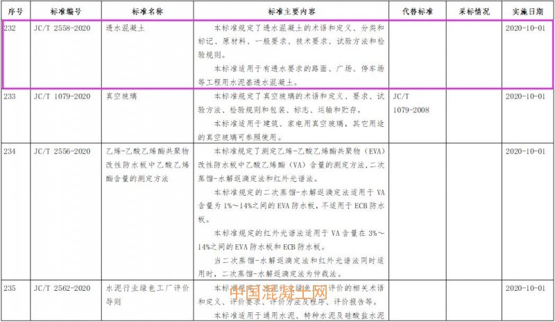 根據(jù)工信部2020年第15號公告,建材行業(yè)標準13項等共計656項行業(yè)標準現(xiàn)予公布,標準樣品自公布之日起實施。其中,標準編號為JC/T 2557-2020的植生混凝土、JC/T 2558-2020的透水混凝土等兩項混凝土行業(yè)標準在列其中,將于2020年10月1日起正式實施。