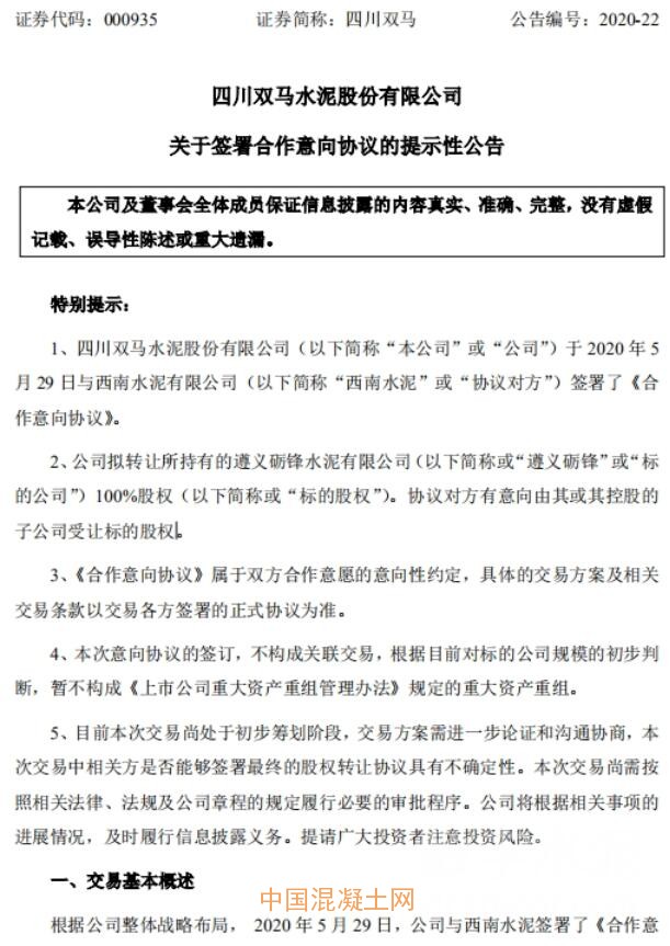 四川雙馬6月1日晚間公告,公司擬向西南水泥有限公司轉(zhuǎn)讓所持有的遵義礪鋒水泥有限公司100%股權(quán),初步判斷暫不構(gòu)成重大資產(chǎn)重組。遵義礪鋒2019年度實(shí)現(xiàn)營業(yè)收入5.63億元,凈利潤6412.7萬元。此次交易實(shí)施后,公司將繼續(xù)聚焦四川區(qū)域水泥業(yè)務(wù)板塊的穩(wěn)定運(yùn)營和穩(wěn)步發(fā)展。