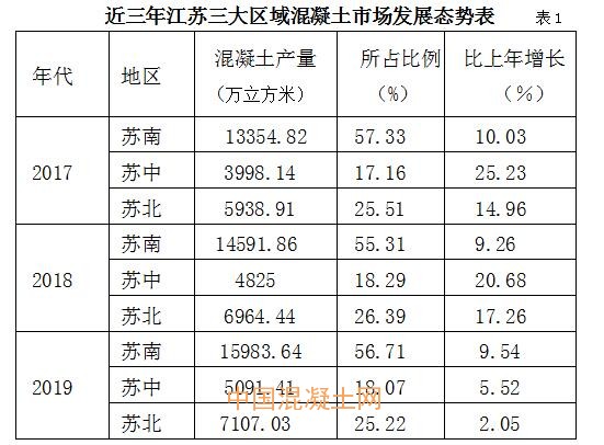 在省委、省政府“加快發(fā)展蘇中、蘇北”和“蘇南、蘇中、蘇北協(xié)同發(fā)展”的戰(zhàn)略部署背景下,2018年,蘇中、蘇北混凝土市場需求增長迅猛,兩大區(qū)域混凝土產(chǎn)量11789萬立方米,比2017年增長18.63%,占全省總量的44.68%;2019年,兩大區(qū)域增長速度明顯回落,混凝土產(chǎn)量12198.44萬立方米,僅比上年增長3.47%,占全省總量的43.28%。