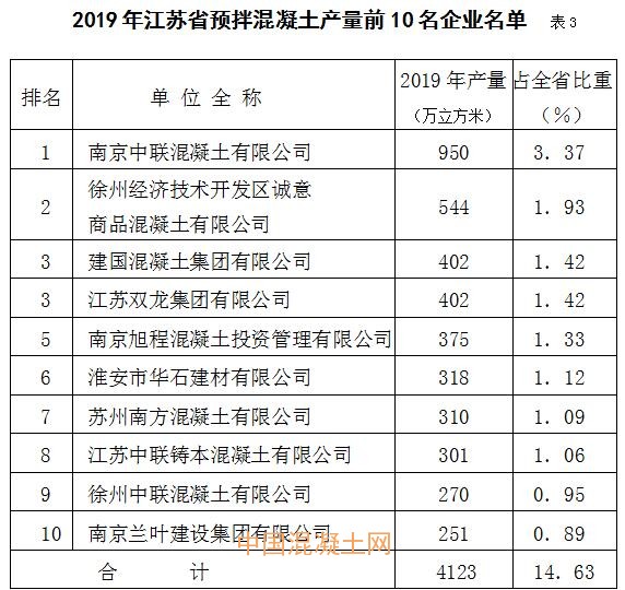 2019年,一批混凝土優(yōu)勢企業(yè)和企業(yè)集團繼續(xù)發(fā)力,成為江蘇省混凝土企業(yè)加快發(fā)展和產(chǎn)業(yè)重新布局的新業(yè)態(tài)。2019年全省混凝土產(chǎn)量超過400萬立方米的企業(yè)有4家,300萬立方米到400萬立方米的有4家,300萬立方米以下,100萬以上的企業(yè)有近40家。全省2019年混凝土產(chǎn)量前10名的企業(yè)銷售量均有不同程度增長,共計達4123萬立方米,占全省供應總量的14.63%,比上年增長1.5個百分點。這10家企業(yè)2019年實現(xiàn)銷售產(chǎn)值累計約216億元,占全省總產(chǎn)值的16.20 %,比上年增長2.6個百分點。(表3)