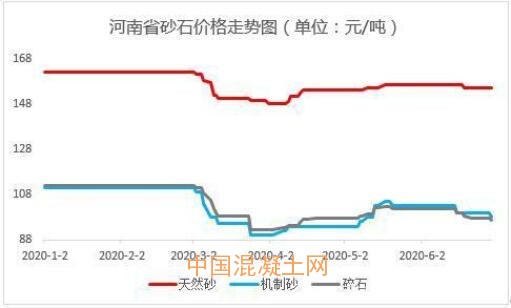 從原材料價格來看:6月30日河南省P.O42.5散裝水泥價格為373元/噸,較年初跌幅150元/噸,天然砂均價155元/噸,較年初下跌7元/噸,機制砂均價98元/噸,較年初下跌14元/噸,碎石均價97元/噸,較年初下跌15元/噸。水泥、砂石等材料價格下跌,原材料成本下降是河南省混凝土價格下跌的重要因素。