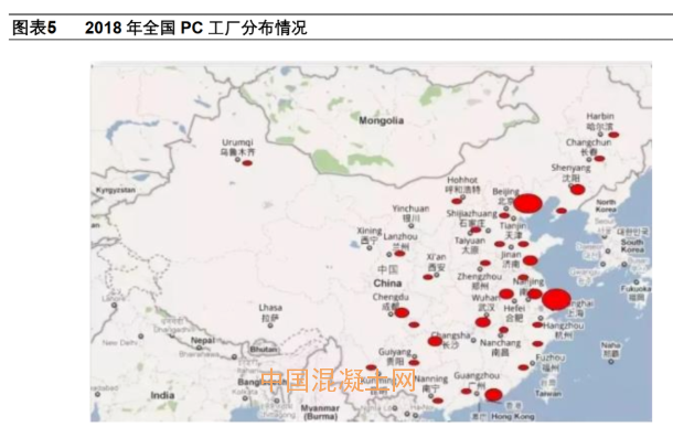 由于各地區的政策目標及推進力度不同,全國的PC工廠布局分布產生不均衡現象。目前PC工廠主要集中在長三角、京津冀等重點推進的大中城市,近期中西部大城市也開始建設PC工廠。北京、上海推進裝配式建筑的政策力度較大,整體技術管理水平較高,PC構件市場初具規模;合肥、南京、深圳、濟南、成都、長沙、武漢等中心城市制定鼓勵發展PC的政策,積極推廣裝配式建筑。根據行業經驗,PC構件的經濟運輸半徑在150公里內,而一二線城市的土地資源極為稀缺,綜合考慮地價和運輸成本等因素,很多PC工廠會選址在距核心需求城市150公里左右的地區。