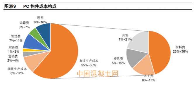 在PC構件成本中,直接生產成本占55%~65%,其中占比最大的是材料費、人工費和模具費;間接生產成本占8%~12%,主要系各類資產折舊和費用攤銷所致。
