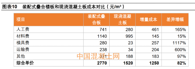 以疊合樓板為例,與現澆混凝土板相比,裝配式疊合樓板的綜合單價高出82%。其中,直接生產成本(人工費、材料費和模具費)和運輸費均高于現澆混凝土板。
