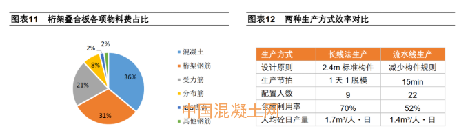 采用長線法生產人均砼日產量比流水線高21%,單線配置人數比流水線少,是較為經濟的生產方式,PC構件成本可降低2.1%。